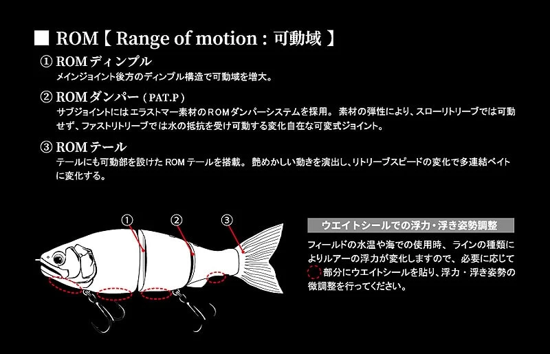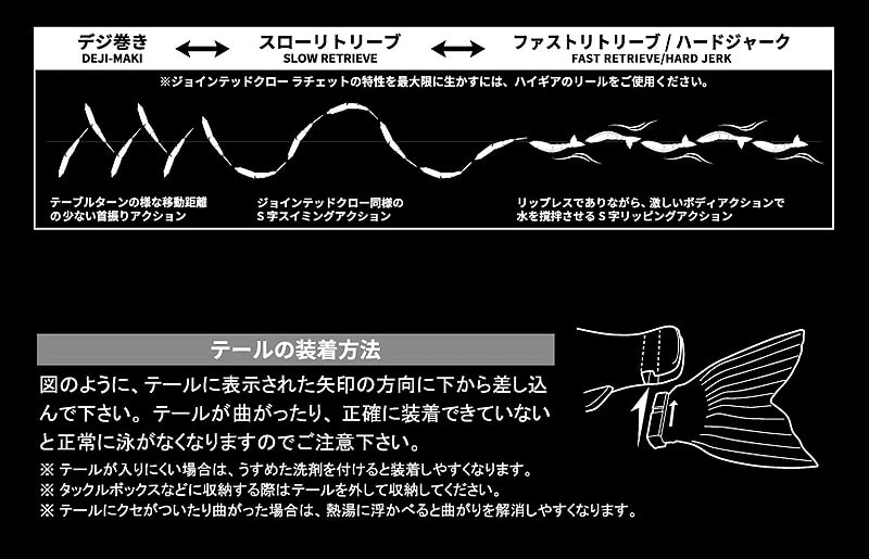 Er eignet sich nicht nur für langsame S-förmiges Schwimmbewegungen sondern auch für extrem schnelles Einholen und harte Jerks, bei denen der Körper heftig geschüttelt wird, was ihm die Fähigkeit verleiht, eine hochattraktive ‚S-förmige Ripping-Action‘ zu erzeugen. Hierbei handelt es sich um die nächste Generation des Jointed Claw.